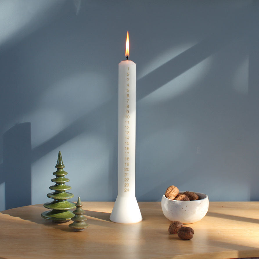 Det hvide kalenderlys med guld giver et tidløst og festligt udtryk, som passer smukt ind i både moderne og klassiske juledekorationer. Perfekt til adventsbordet, som gave eller som et varmt indslag i hjemmets julehygge.