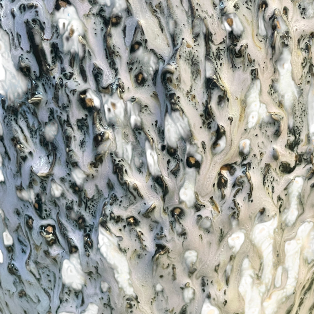 Denne organiske vase er et markant stykke kunsthåndværk med et råt og levende udtryk. Overfladen er kraftigt tekstureret med dybe, organiske fordybninger, der giver vasen karakter og et næsten naturformet præg. Den råhvide glasur har et tydeligt grønligt spil, som varierer naturligt og understreger, at der er tale om en ægte unika organisk vase, hvor ingen to er ens.