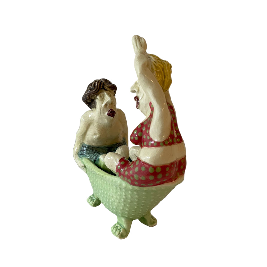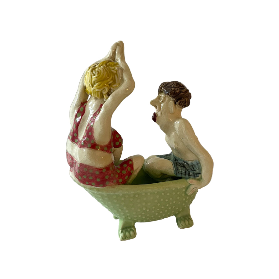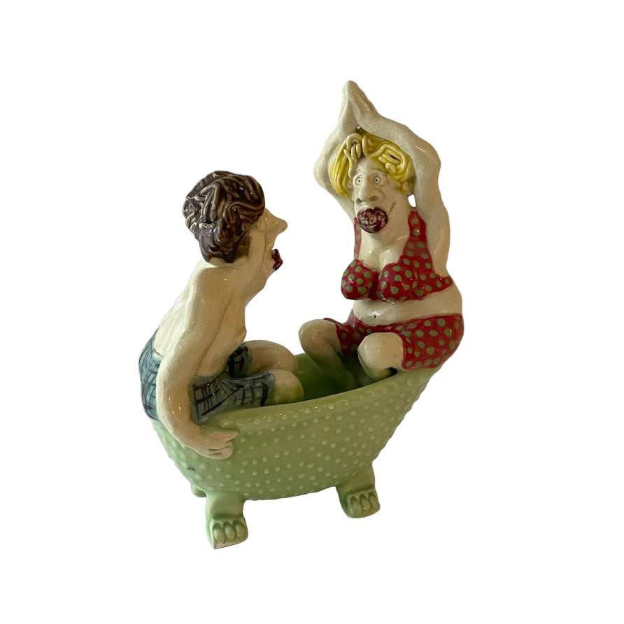 Hanne Marie Leth Andersen laver badekar, der bestemt ikke bare er til at dyppe tæerne i – de er til at smile af. Med en blanding af legesyge former, finurlige detaljer og et strejf af skæv humor minder hendes værker os om, at hverdagen gerne må boble lidt mere end sæbeskummet gør.
