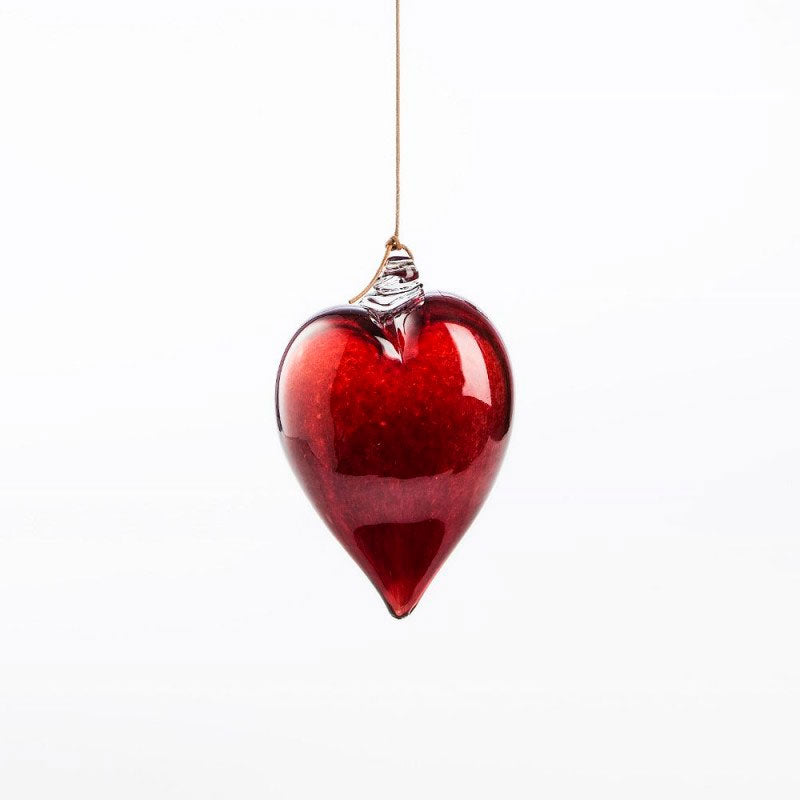 Dette smukke mundblæste glashjerte er skabt til at pynte i ethvert julehjem. Hvert hjerte er håndlavet og unikt i udtrykket, hvilket gør dem til en særlig og personlig detalje på juletræet eller i vinduet.