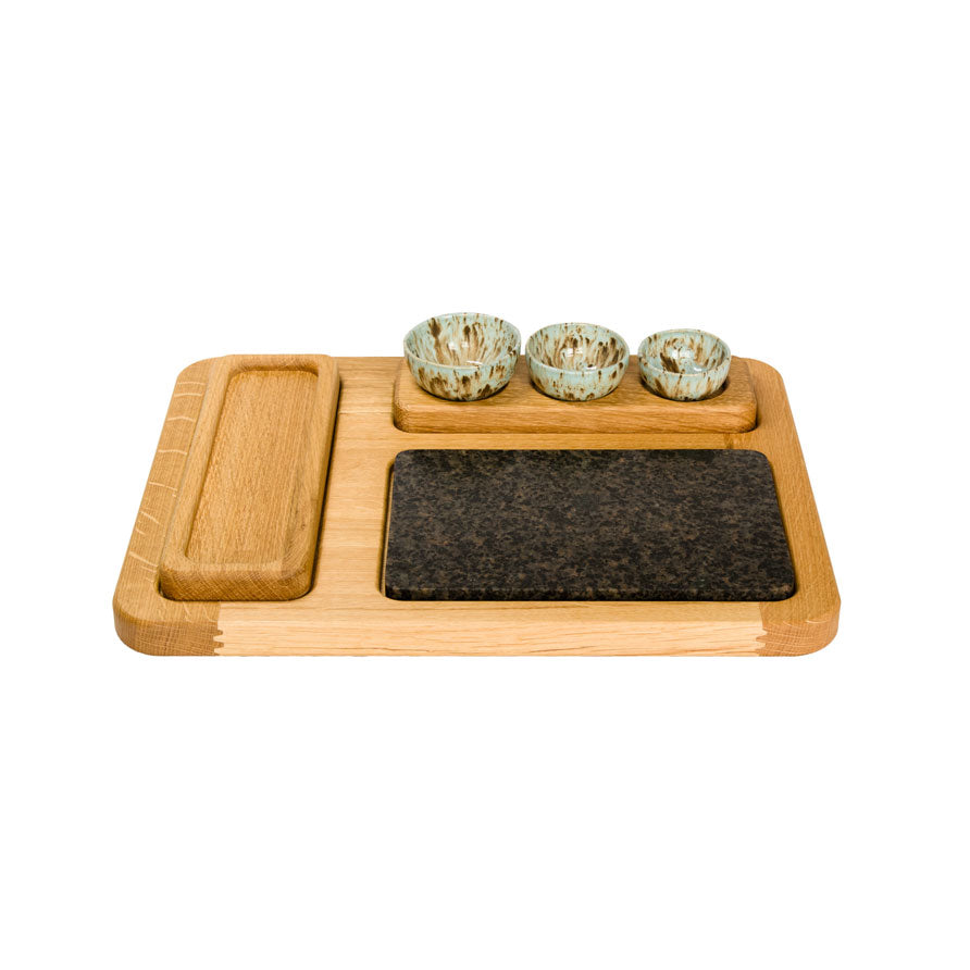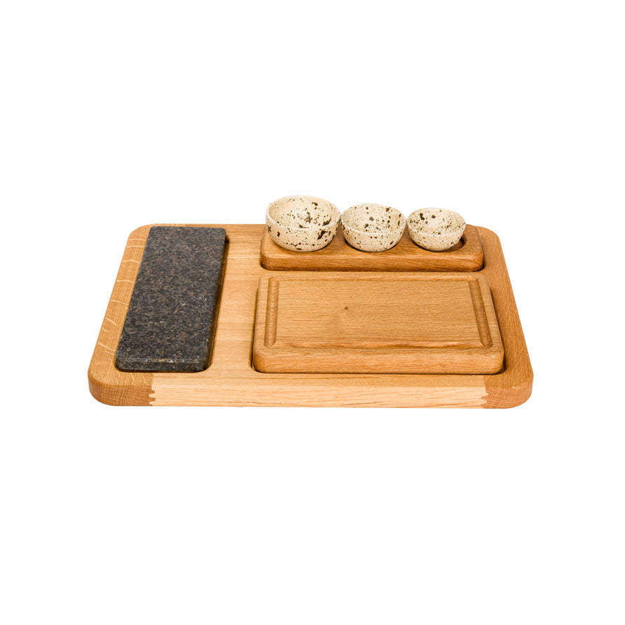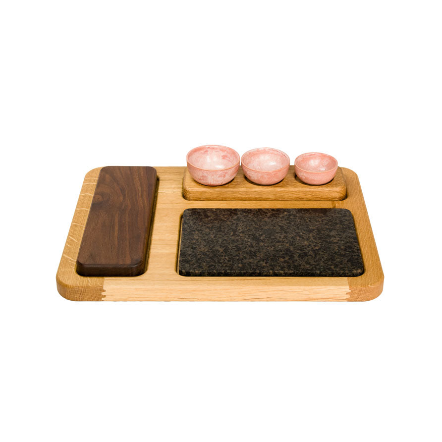 "Symfoni" er en unik serveringsbakke i egetræ, inspireret af den bornholmske natur. Designet giver dig frihed til selv at bestemme, hvilke materialer der skal udgøre dit personlige sæt – et fleksibelt koncept, hvor kun fantasien sætter grænser.