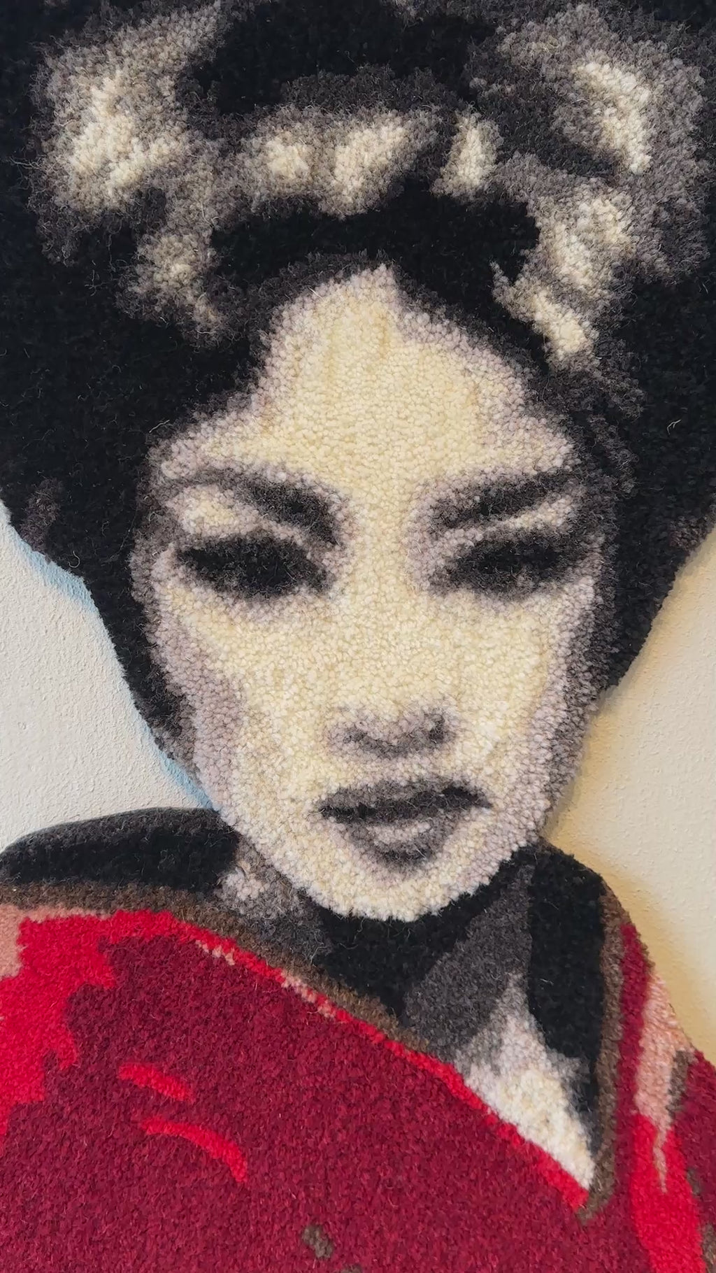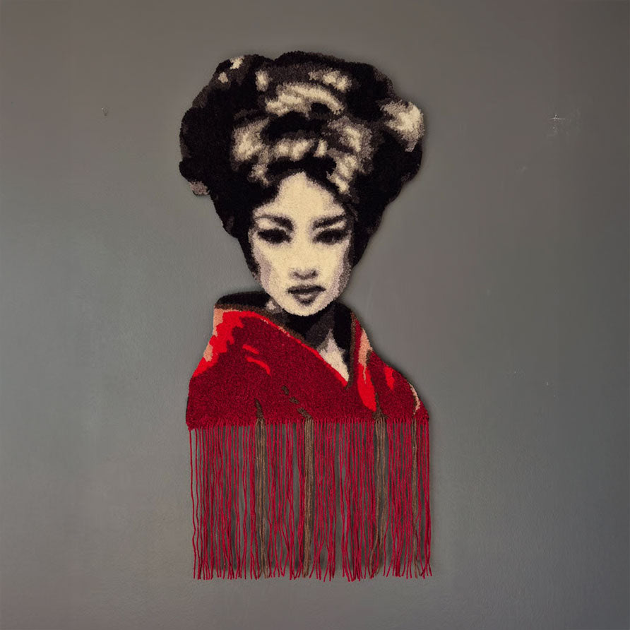 Tuftet Kvinde til Væggen er et unikt, håndlavet vægtæppe skabt af Raaholts Tuft. Værket er en del af et særligt tæppeunivers.