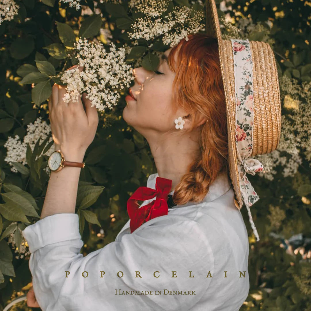 De fine blomster er monteret på forgyldte sølvstikker og er både diskrete og iøjnefaldende på samme tid. Hver blomst er unik og bærer tydeligt præg af det håndlavede – præcis som resten af Poporcelains kollektioner.